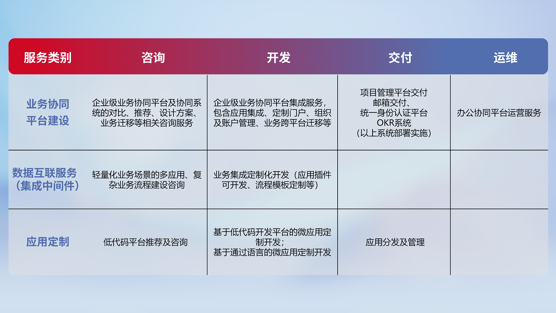 针对钉钉、、、企微、、、IDaas等平台级产品提供产品的规划、、方案、、、交付、、、定制化开发等服务,,实现如统一协同办公、、智能客户服务、、、、混合会议管理、、、、智能数据查询、、、等业务场景,,,,实现数字化转型。。。